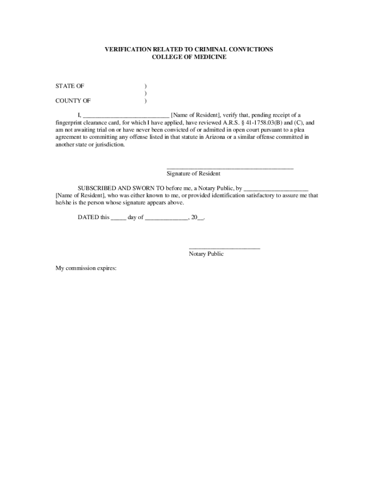 VERIFICATION RELATED TO CRIMINAL CONVICTIONS COLLEGE OF MEDICINESTATE OF COUNTY OF)))I, ___ [Name of Resident], verify that, pending receipt of a fingerprint clearance card, for which I have applied,