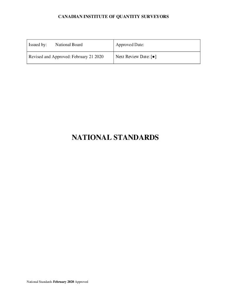 CANADIAN INSTITUTE OF QUANTITY SURVEYORSIssued by:National BoardRevised and Approved: February 21 2020Approved Date: Next Review Date: []NATIONAL STANDARDSNational Standards February 2020 ApprovedPREAMBLE