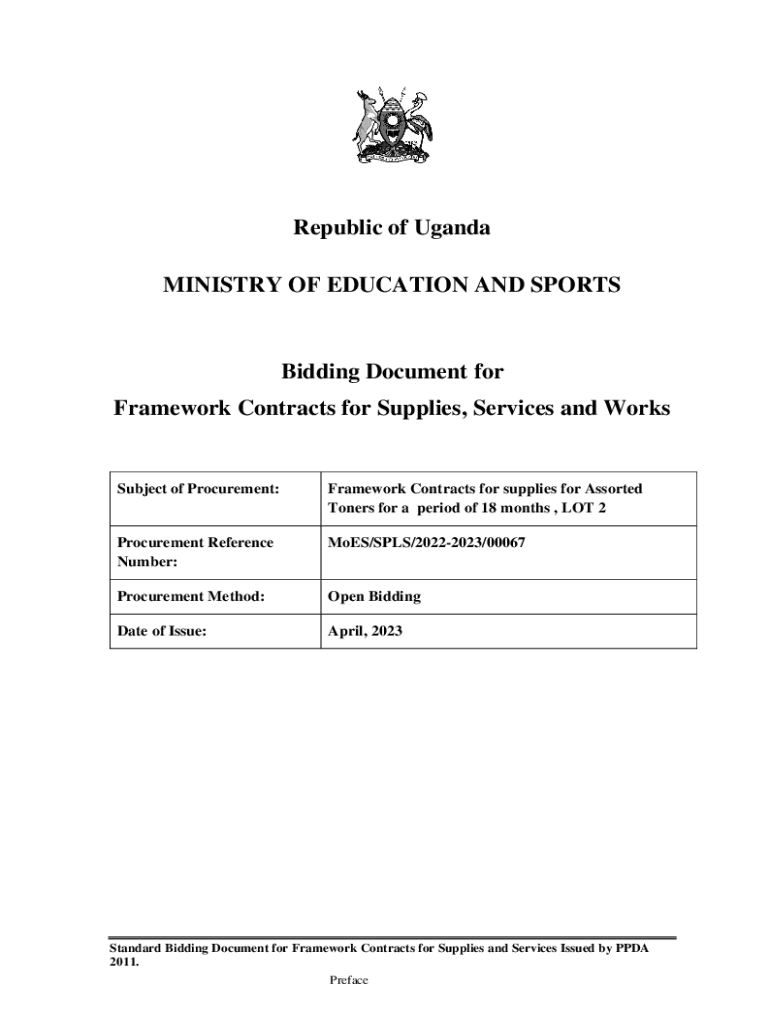 Republic of Uganda MINISTRY OF EDUCATION AND SPORTSBidding Document for Framework Contracts for Supplies, Services and WorksSubject of Procurement:Framework Contracts for supplies for Assorted Toners