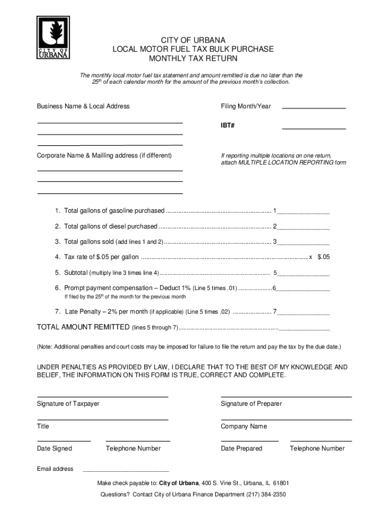 CITY OF URBANA LOCAL MOTOR FUEL TAX BULK PURCHASE MONTHLY TAX RETURN The monthly local motor fuel tax statement and amount remitted is due no later than the 25th of each calendar month for the amount