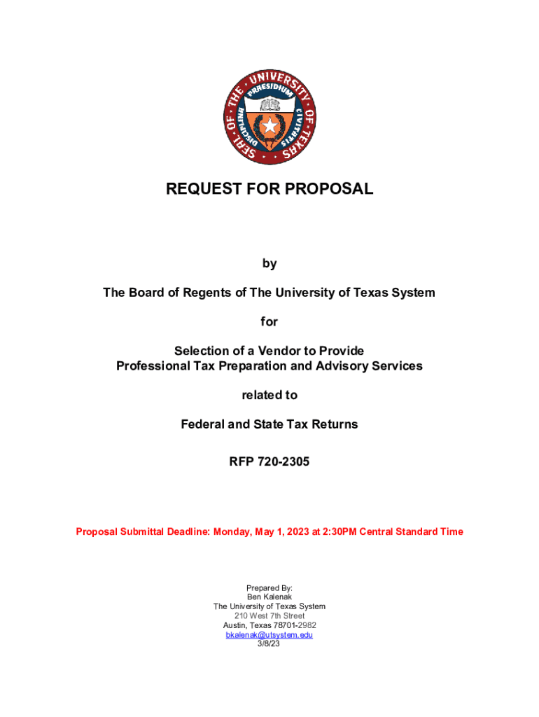 REQUEST FOR PROPOSAL by The Board of Regents of The University of Texas System for Selection of a Vendor to Provide Professional Tax Preparation and Advisory Services related to Federal and State