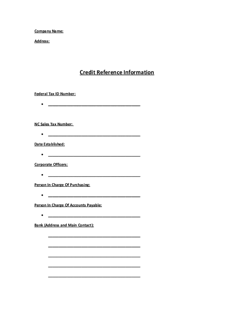 Company Name: Address:Credit Reference Information Federal Tax ID Number: ___NC Sales Tax Number: ___Date Established: ___Corporate Officers: ___Person In Charge Of Purchasing: ___Person In Charge