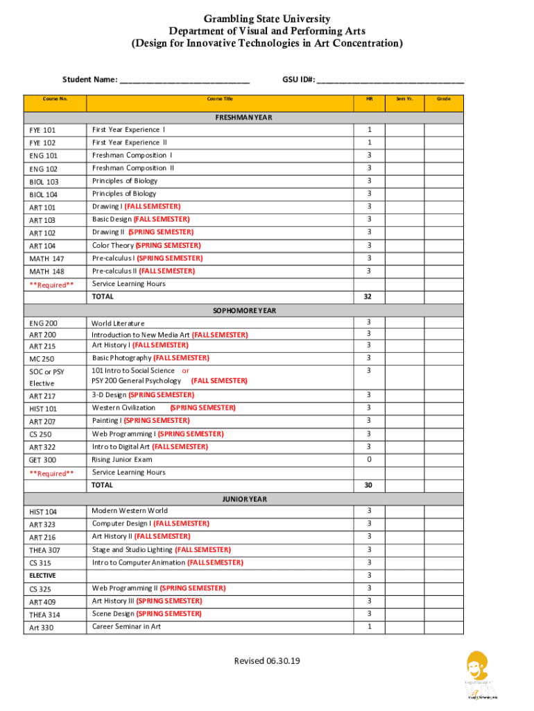 Gambling State University Department of Visual and Performing Arts (Design for Innovative Technologies in Art Concentration) Student Name: ___ Course No. CSU ID#: ___Course TitleHRFRESHMAN YEAR FYE