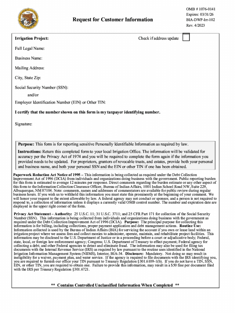 The bia-dwp-irr-102 request form must be completed with accurate customer information, signed by an authorized representative, and submitted to the relevant agency.