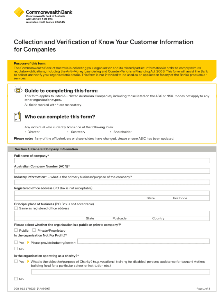 Collection and Verification of Know Your Customer Information for Companies Purpose of this form: The Commonwealth Bank of Australia is collecting your organization and its related parties information