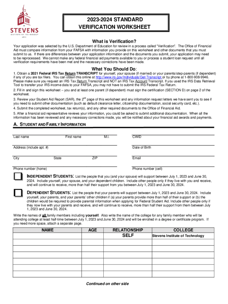 20232024 STANDARD VERIFICATION Worksheets What is Verification? Your application was selected by the U.S. Department of Education for review in a process called Verification. The Office of Financial