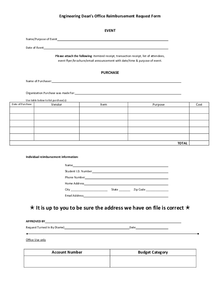 Engineering Deans Office Reimbursement Request Form EVENT Name/Purpose of Event Date of Event Please attach the following: itemized receipt, transaction receipt, list of attendees, event flyer/brochure/email