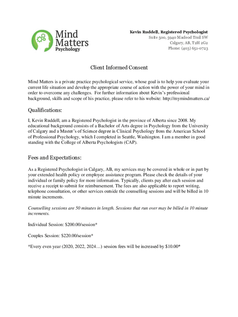 Kevin Russell, Registered Psychologist Suite 500, 5940 MacLeod Trail SW Calgary, AB, T2H 2G2 Phone: (403) 6510723Client Informed Consent Mind Matters is a private practice psychological service, whose