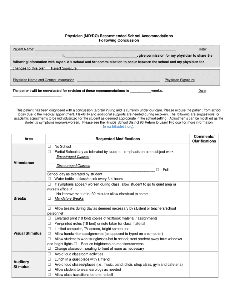 Physician (MD/DO) Recommended School Accommodations Following Concussion Patient Name: ___Date:___ I, ___, give permission for my physician to share the following information with my children school