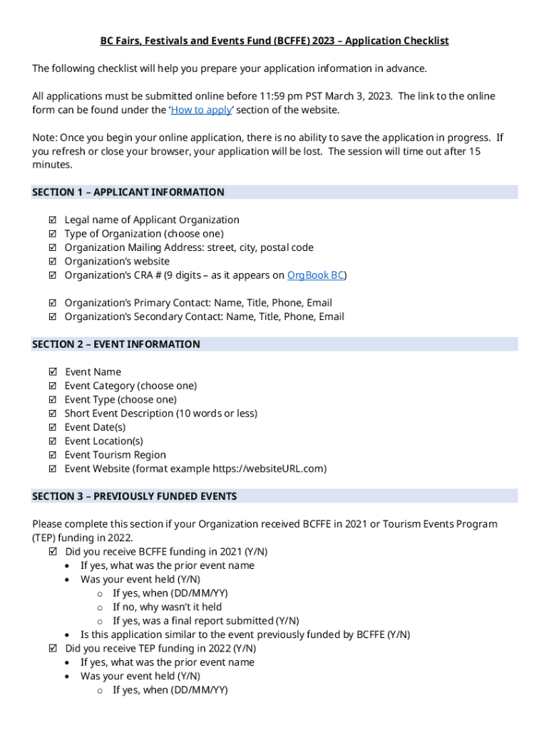 BC Fairs, Festivals and Events Fund (BC FFE) 2023 Application Checklist The following checklist will help you prepare your application information in advance. All applications must be submitted online