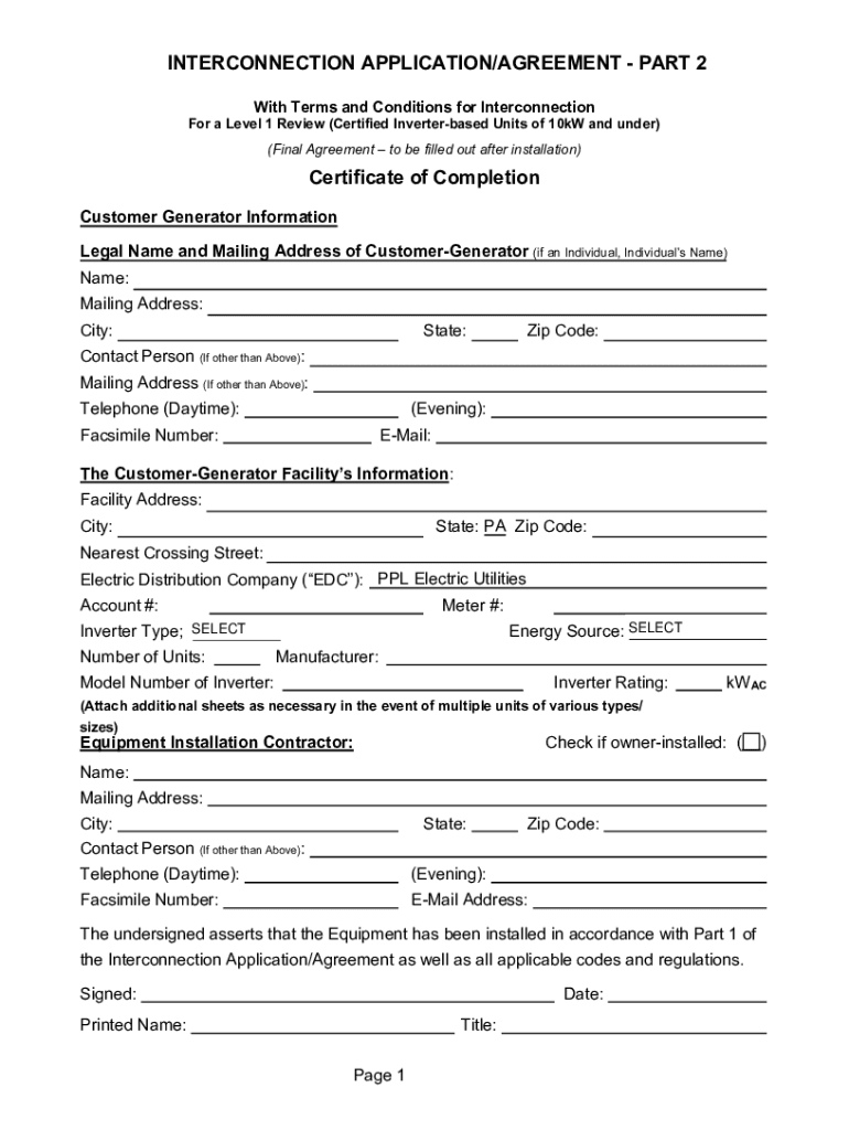 INTERCONNECTION APPLICATION/AGREEMENT PART 2 With Terms and Conditions for Interconnection a Level 1 Review (Certified Inverter based Units of 10kW and under) (Final Agreement to be filled out after