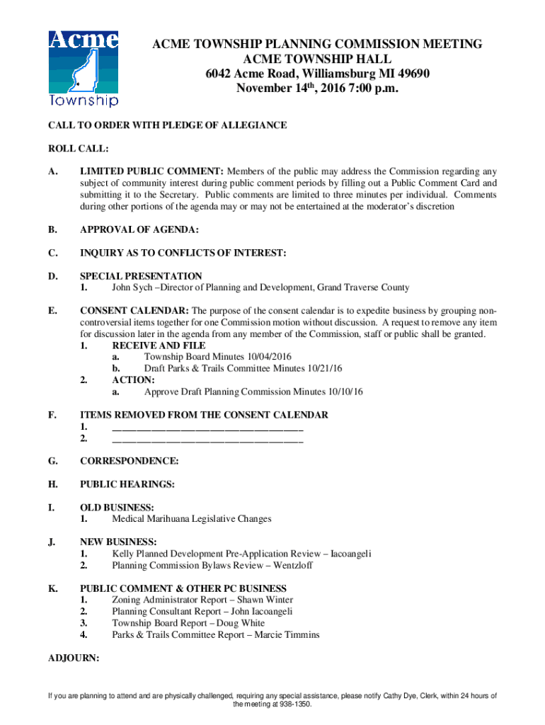 ACME TOWNSHIP PLANNING COMMISSION MEETING ACME TOWNSHIP HALL 6042 Acme Road, Williamsburg MI 49690 November 14th, 2016 7:00 p.m. CALL TO ORDER WITH PLEDGE OF ALLEGIANCE ROLL CALL: A.LIMITED PUBLIC