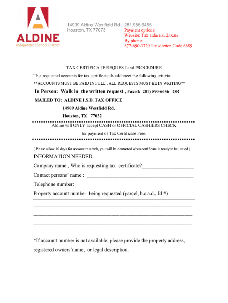 14909 Aldine Westfield Rd Houston, TX 77073281.985.6455 Payment options: Website: Tax. Aldine.k12.TX.us By phone: 8776903729 Jurisdiction Code 6689TAX CERTIFICATE REQUEST and PROCEDURE The requested