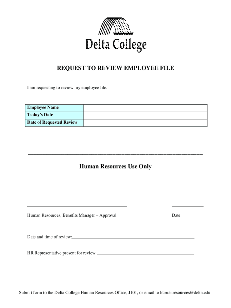 REQUEST TO REVIEW EMPLOYEE FILE I am requesting to review my employee file. Employee Name Today's Date of Requested Review___ Human Resources Use Only______Human Resources, Benefits Manager ApprovalDateDate