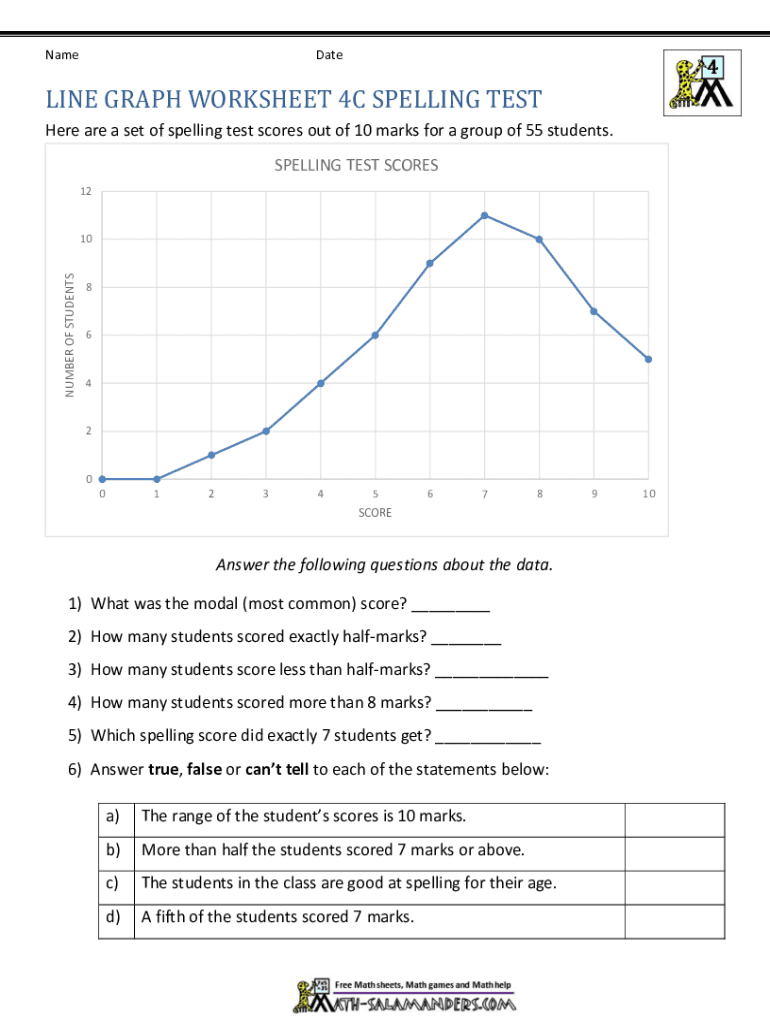 NameDateLINE GRAPH WORKSHEET 4C SPELLING TEST Here are a set of spelling test scores out of 10 marks for a group of 55 students. SPELLING TEST SCORES 12NUMBER OF STUDENTS1086420 012345678SCOREAnswer