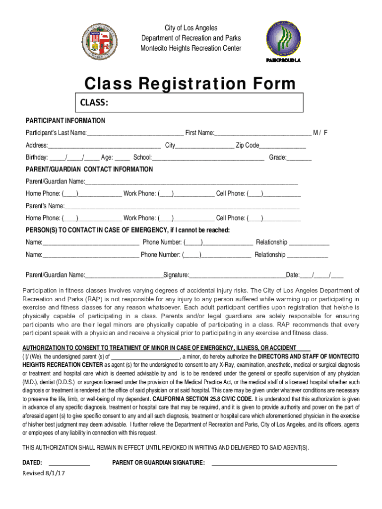 City of Los Angeles Department of Recreation and Parks Montevideo Heights Recreation Center Class Registration Form CLASS: PARTICIPANT INFORMATION Participants Last Name:___ First Name:___ M / F Address:___