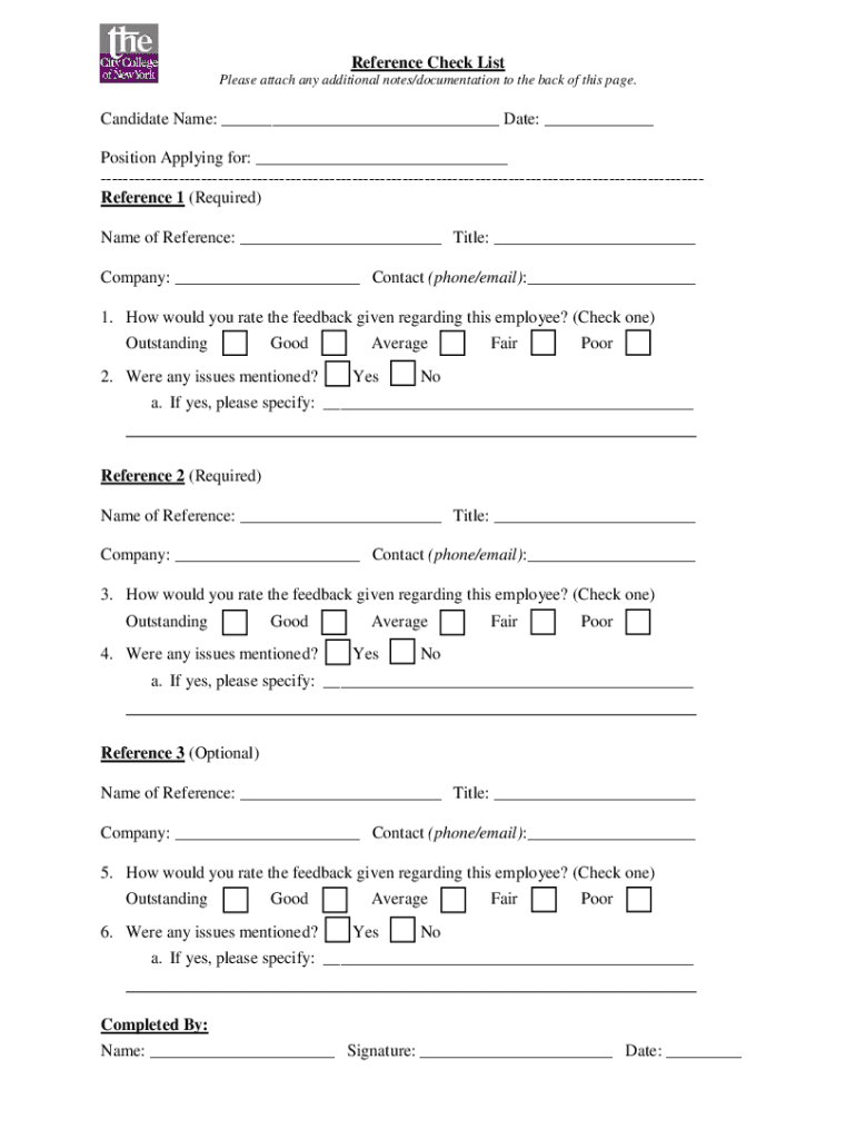 Reference Check List Please attach any additional notes/documentation to the back of this page. Candidate Name: ___ Date: ___ Position Applying for: ___ Reference 1 (Required) Name of Reference: ___