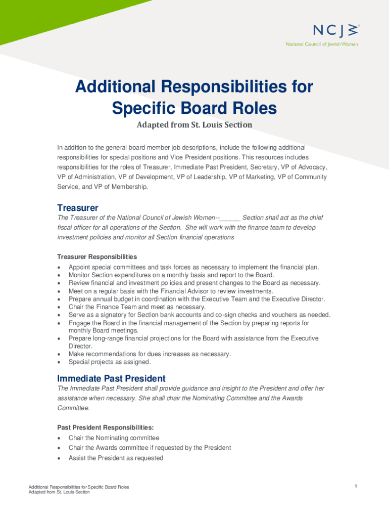 Additional Responsibilities for Specific Board Roles Adapted from St. Louis Section In addition to the general board member job descriptions, include the following additional responsibilities for