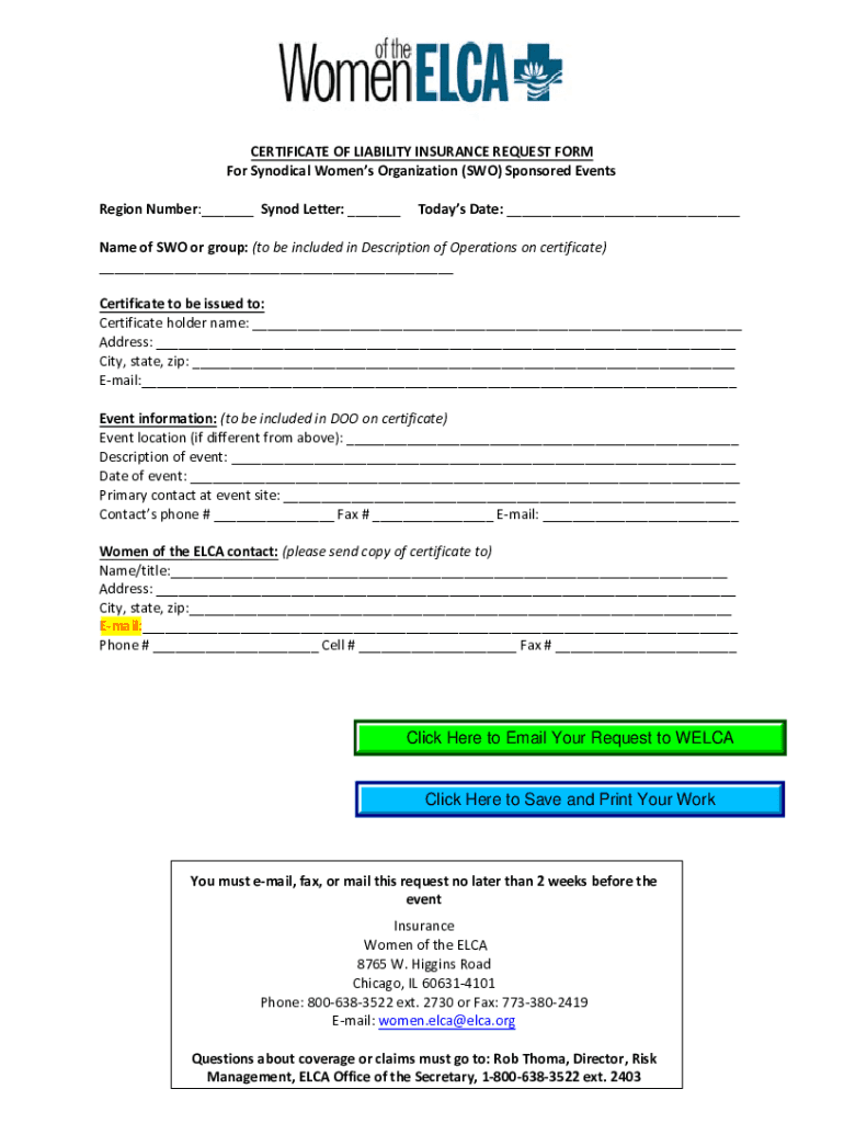 CERTIFICATE OF LIABILITY INSURANCE REQUEST FORM For Synovial Women's Organization (TWO) Sponsored Events Region Number:___ Synod Letter: ___Today's Date: ___Name of TWO or groups: (to be included