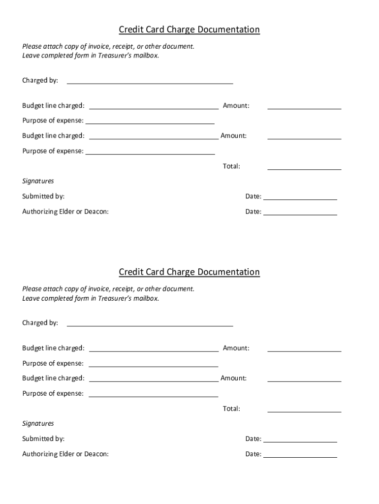 Credit Card Charge Documentation Please attach copy of invoice, receipt, or other document. Leave completed form in Treasurers mailbox. Charged by:___Budget line charged: ___ Amount:___Purpose of