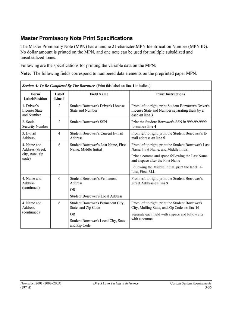 3-36. Master Promissory Note Print Specifications. The Master Promissory Note (MPN) has a unique 21-character MPN Identification ... Print the Student Borrower#39’s SSN in 999-99-9999 format on