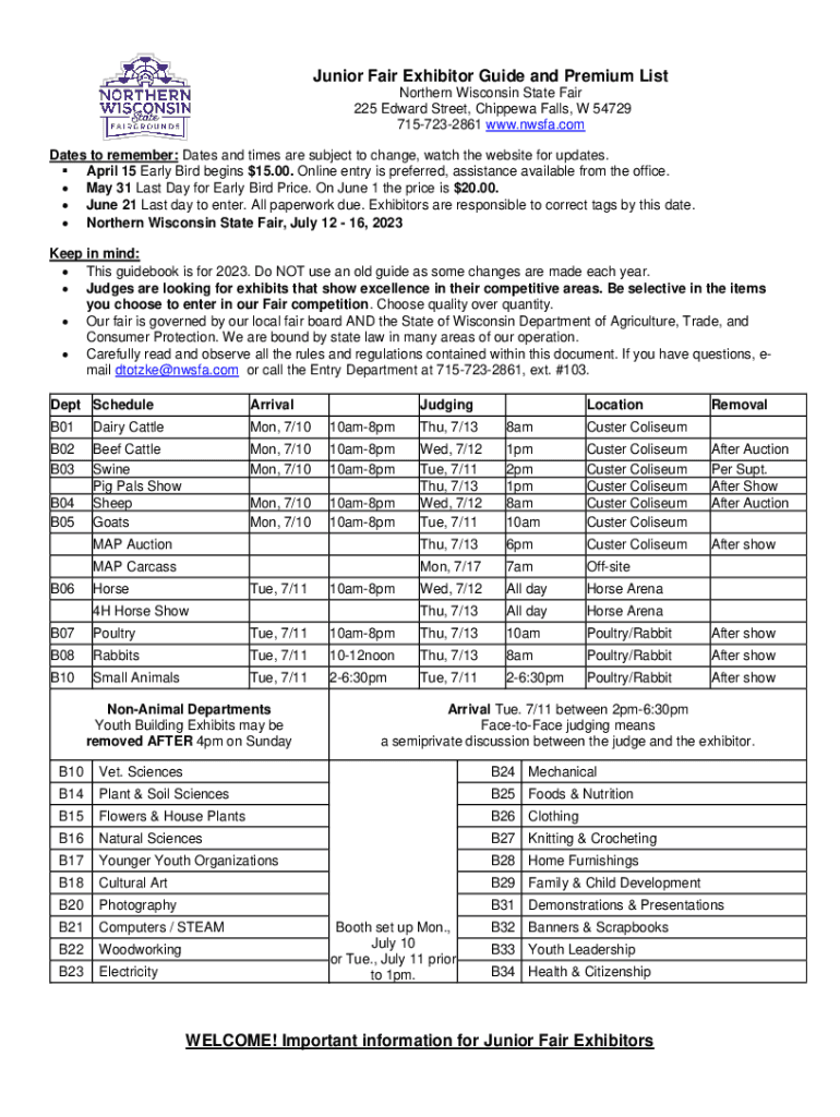 Junior Fair Exhibitor Guide and Premium List Northern Wisconsin State Fair 225 Edward Street, Chippewa Falls, W 54729 7157232861 www.nwsfa.com Dates to remember: Dates and times are subject to change,