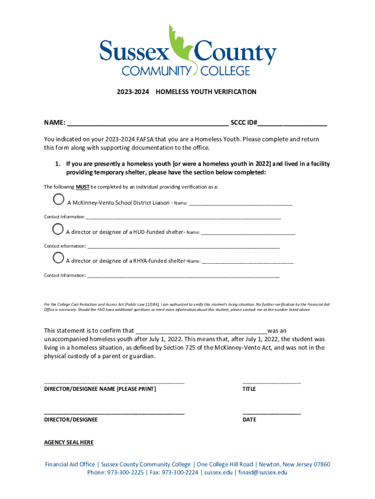 20232024 HOMELESS YOUTH VERIFICATIONNAME: ___ CCC ID#___ You indicated on your 20232024 FAFSA that you are a Homeless Youth. Please complete and return this form along with supporting documentation