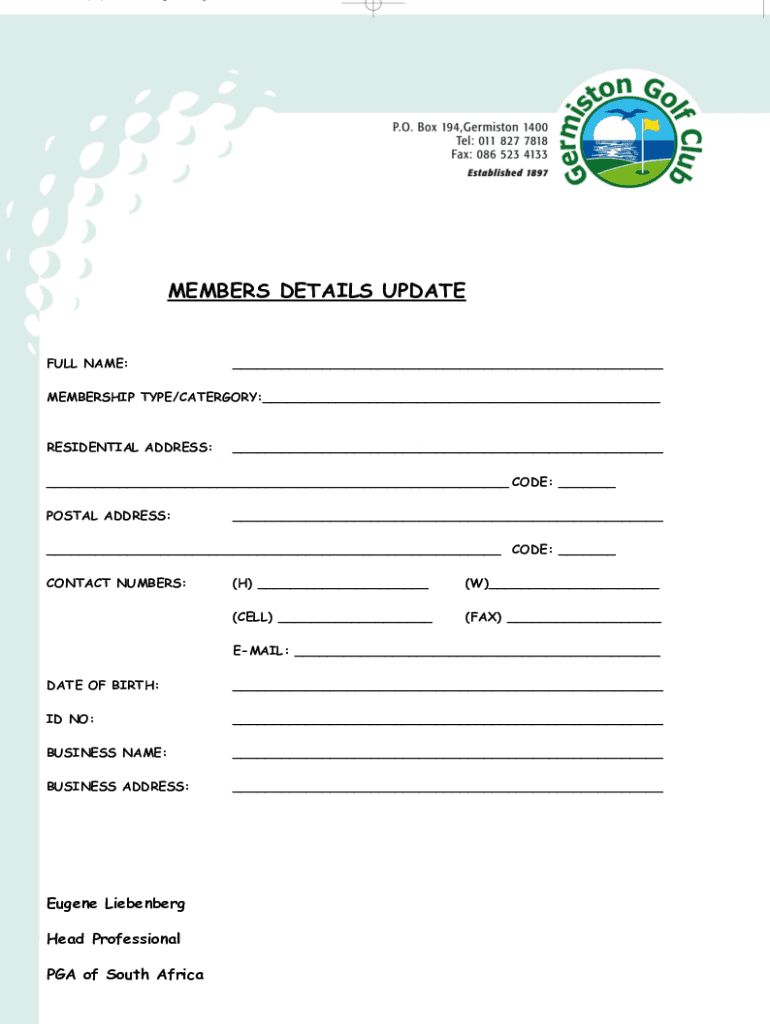 MEMBERS DETAILS PLATEFUL NAME:___MEMBERSHIP TYPE/CATEGORY:___RESIDENTIAL ADDRESS:______ CODE: ___ POSTAL ADDRESS:______ CODE: ___ CONTACT NUMBERS:(H) ___(W)___(CELL) ___(FAX) ___EMAIL: ___ DATE OF
