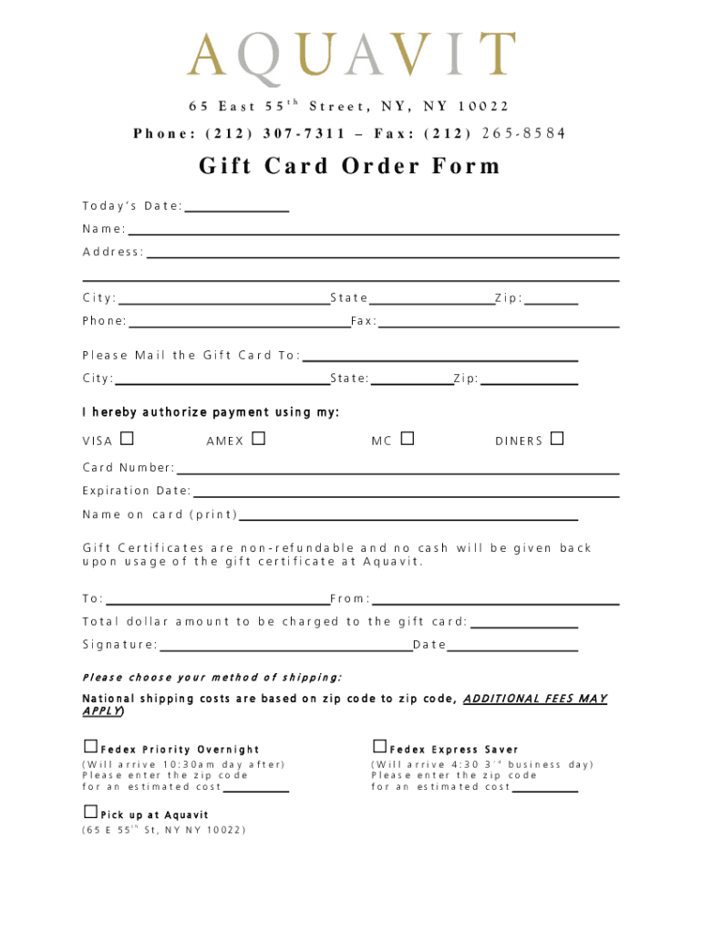 65 East 55t street, NY, NY 10022Phone: (212) 3077311 Fax: (212) 2658584Gift Card Order Form Today's Date: Name: Address:City:Telephone:Zip:Fax:Please Mail the Gift Card To: City:State:Zip:I hereby