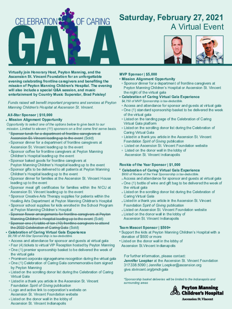 Saturday, February 27, 2021, A Virtual EventVirtually join Honorary Host, Peyton Manning, and the Ascension St. Vincent Foundation for an unforgettable evening celebrating frontline caregivers and