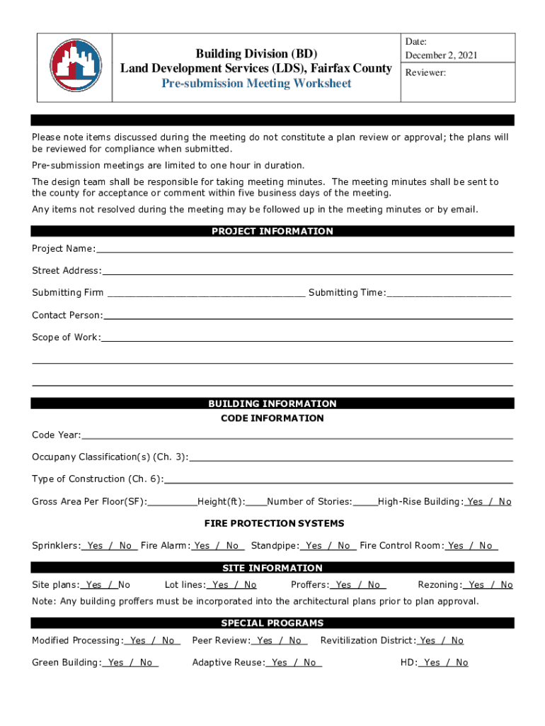 Building Division (BD) Land Development Services (LDS), Fairfax County Presubmission Meeting WorksheetDate: December 2, 2021, Reviewer:Please note items discussed during the meeting do not constitute