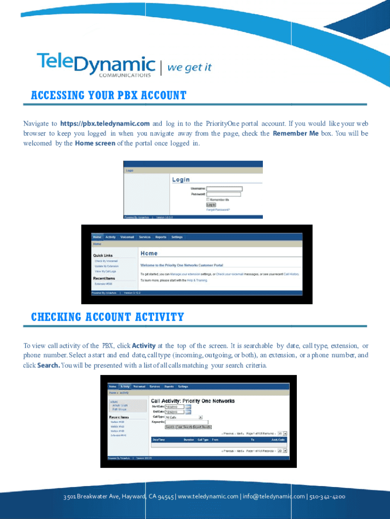 ACCESSING YOUR PBX ACCOUNT Navigate to https://pbx.teledynamic.com and log in to the Priority portal account. If you would like your web browser to keep you logged in when you navigate away from the