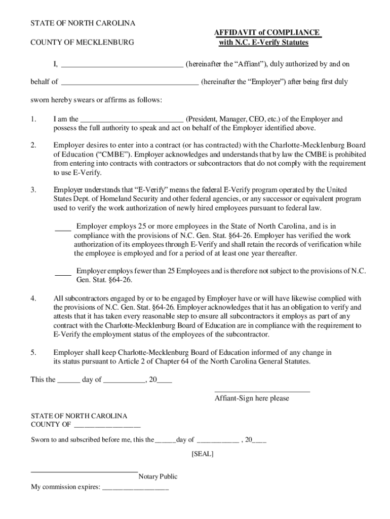 STATE OF NORTH CAROLINA AFFIDAVIT of COMPLIANCE with N.C. Verify StatutesCOUNTY OF MECKLENBURG, ___ (hereinafter the Affine), duly authorized by and on behalf of ___ (hereinafter the Employer) after