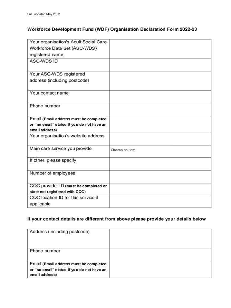 Last updated May 2022Workforce Development Fund (WWF) Organization Declaration Form 202223 Your organization\'s Adult Social Care Workforce Data Set (ASC WDS) registered name ASC WDS ID Your ASC WDS