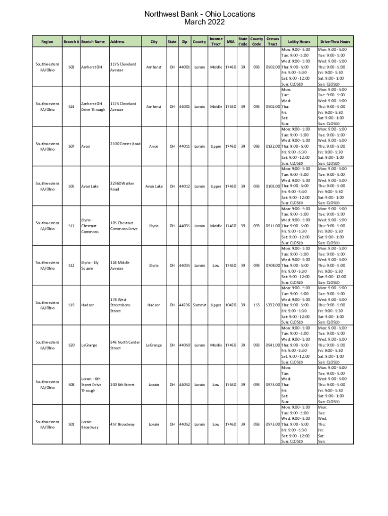 Northwest Bank Ohio Locations March 2022 Region Branch # Branch NameAddressCityStateZipCountyIncome State County Census MSA Tract Code TractSouthwestern PA/Ohio503Amherst OH1175 Cleveland AvenueAmherstOH44001LorainMiddle