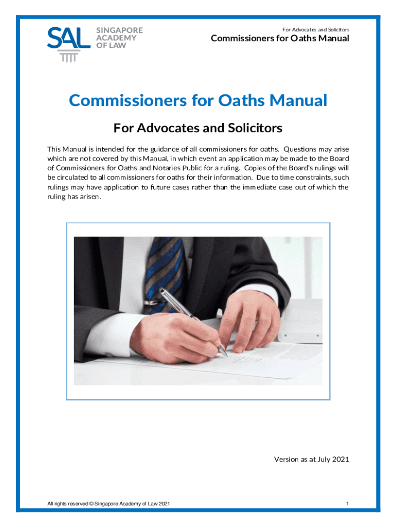 For Advocates and SolicitorsCommissioners for Oaths ManualCommissioners for Oaths Manual For Advocates and Solicitors This Manual is intended for the guidance of all commissioners for oaths. Questions