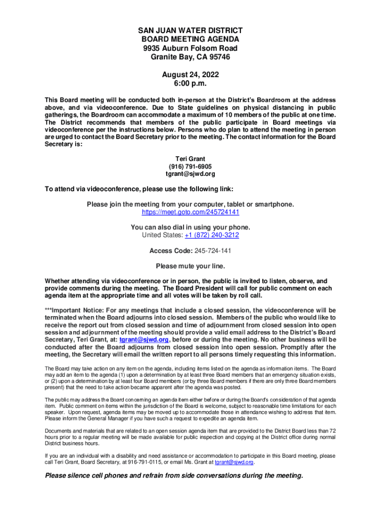 SAN JUAN WATER DISTRICT BOARD MEETING AGENDA 9935 Auburn Folsom Road Granite Bay, CA 95746 August 24, 2022 6:00 p.m. This Board meeting will be conducted both unperson at the Districts Boardroom at