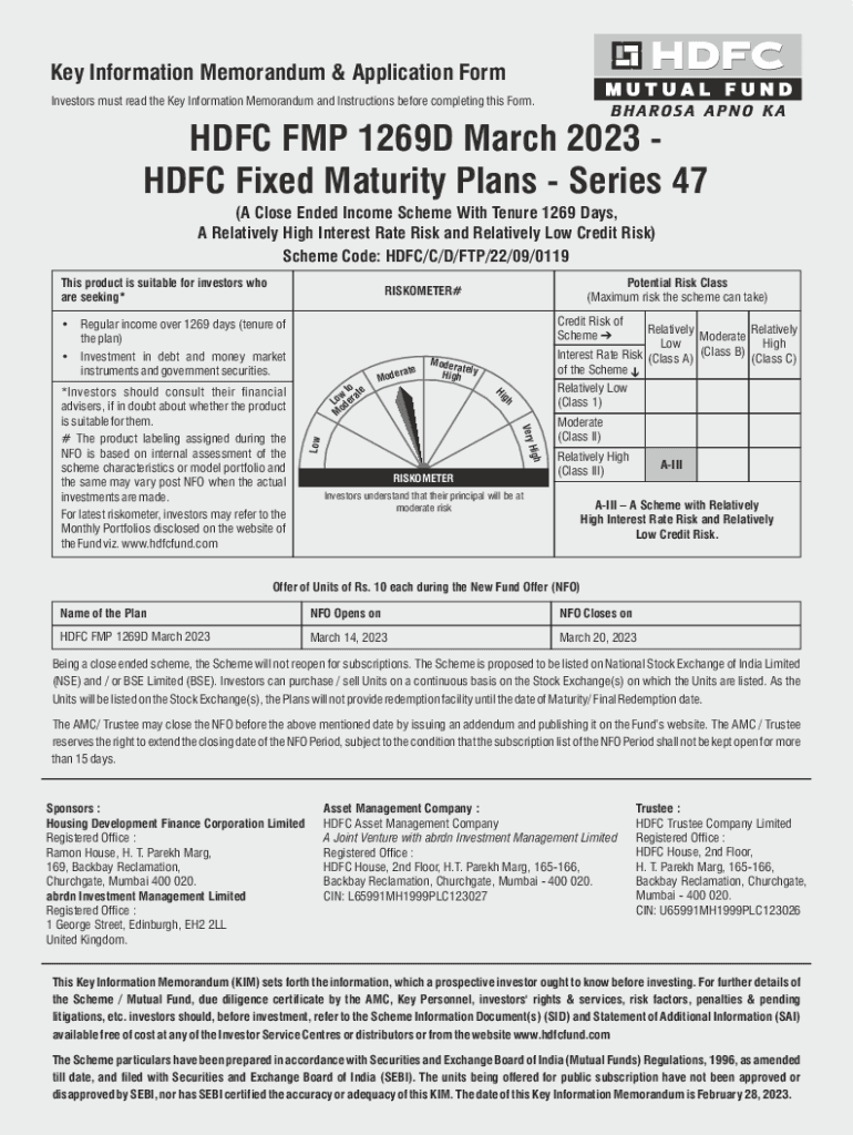 Key Information Memorandum & Application Form Investors must read the Key Information Memorandum and Instructions before completing this Form. HDFC FMP 1269D March 2023 HDFC Fixed Maturity Plans Series