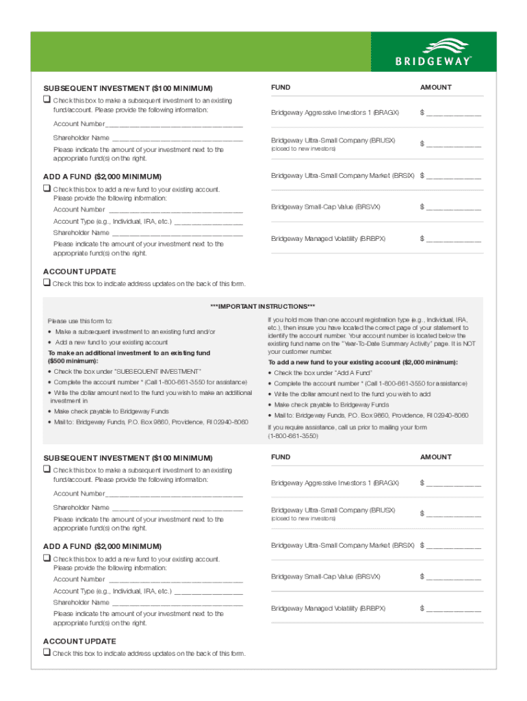 SUBSEQUENT INVESTMENT ($100 MINIMUM)FUNDAMOUNTBridgeway Aggressive Investors 1 (BRAGG)$___Bridleway Ultras mall Company (BRUSH)(closed to new investors)$___check this box to make a subsequent investment