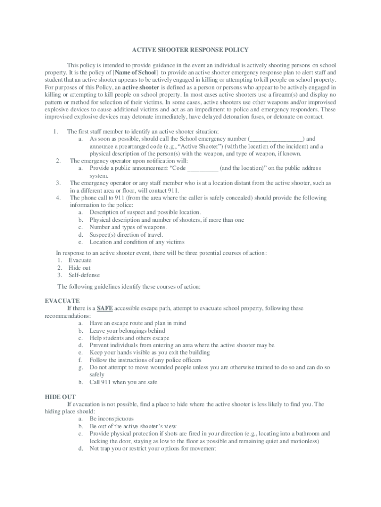 ACTIVE SHOOTER RESPONSE POLICY This policy is intended to provide guidance in the event an individual is actively shooting persons on school property. It is the policy of [Name of School] to provide