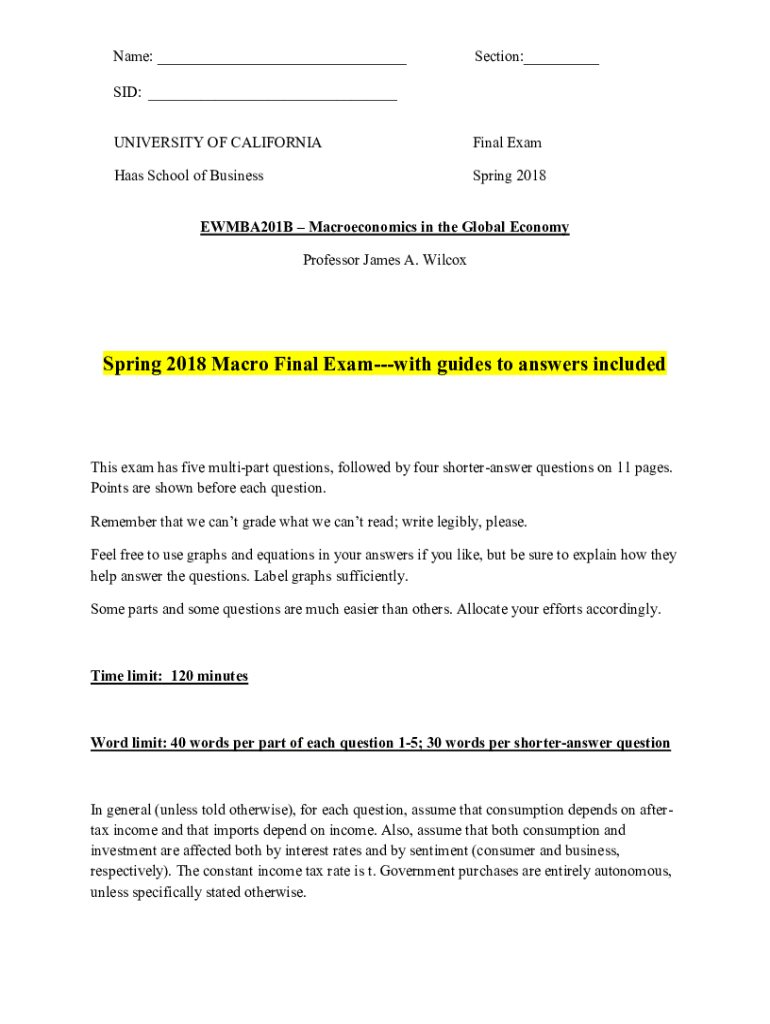 UNIVERSITY OF CALIFORNIAFinal Exam Haas School of BusinessSpring 2018EWMBA201B Macroeconomics in the Global Economy