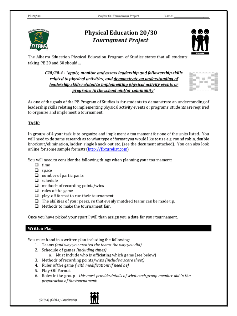 PE 20/30Project C4: Tournament Projectile: ___Physical Education 20/30 Tournament Project The Alberta Education Physical Education Program of Studies states that all students taking PE 20 and 30 should