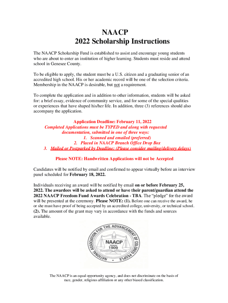 NAACP 2022 Scholarship Instructions The NAACP Scholarship Fund is established to assist and encourage young students who are about to enter an institution of higher learning. Students must reside