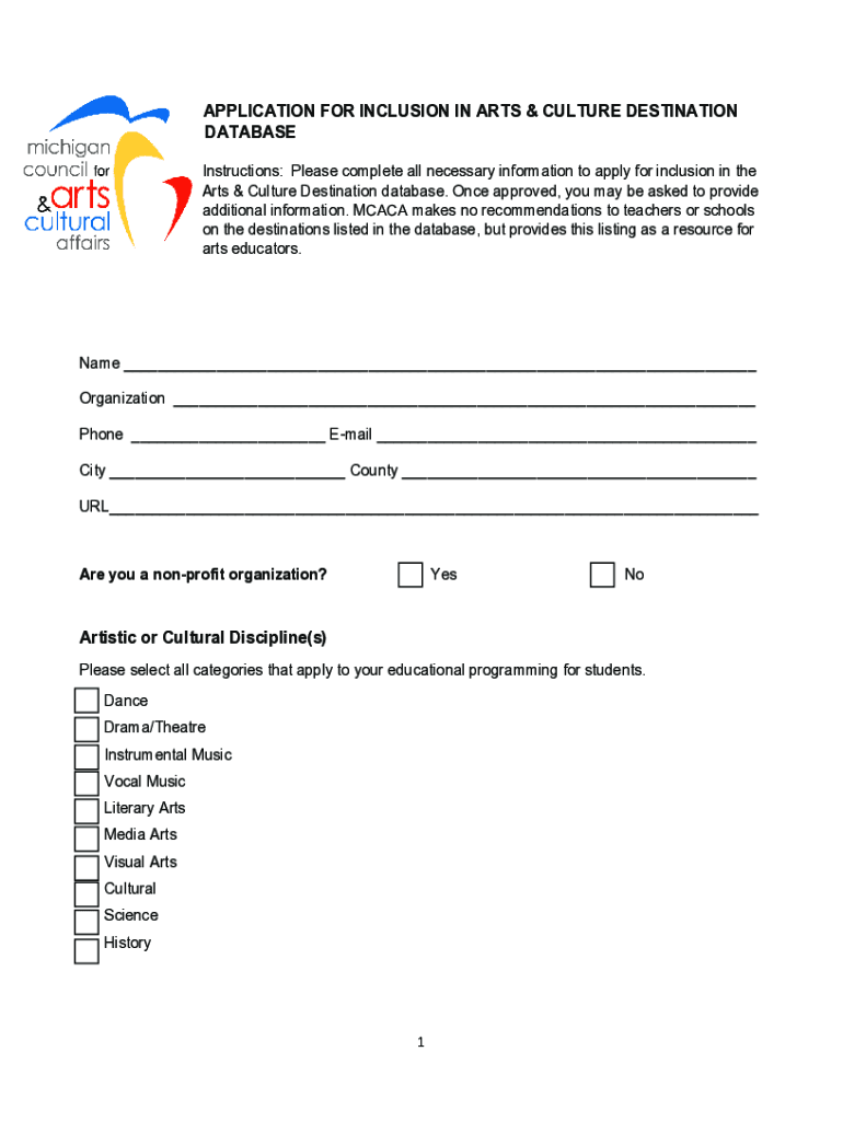 Get the free Application for Inclusion in Arts & Culture Destination ...