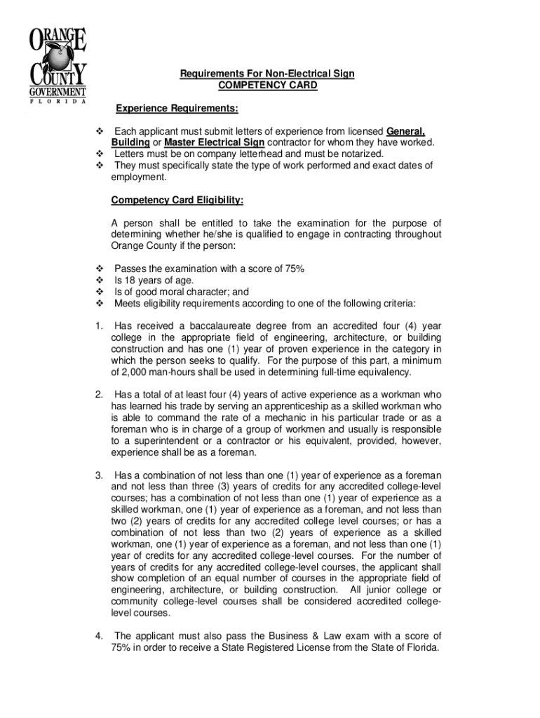 Requirements For Nonelectrical Sign COMPETENCY CARD Experience Requirements: Each applicant must submit letters of experience from licensed General, Building or Master Electrical Sign contractor for
