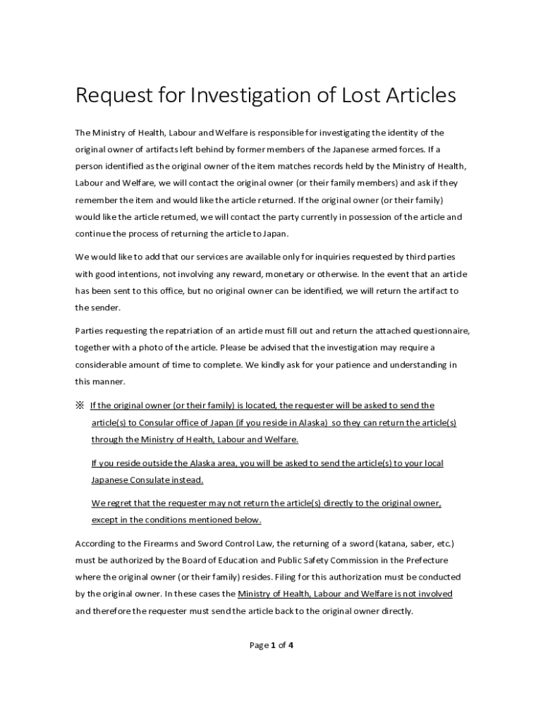 Request for Investigation of Lost Articles The Ministry of Health, Labor and Welfare is responsible for investigating the identity of the original owner of artifacts left behind by former members