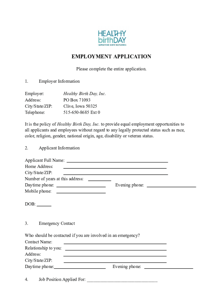 Get the free Healthy Birth Day, Inc. Employment Application.docx