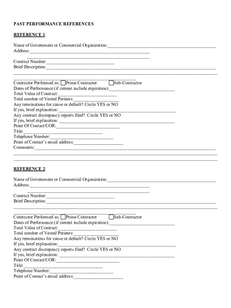PAST PERFORMANCE REFERENCES REFERENCE 1: Name of Government or Commercial Organization:___ Address:___ ___ Contract Number:___ Brief Description:___ ___ ___ Contractor Performed as: Prime Contractor