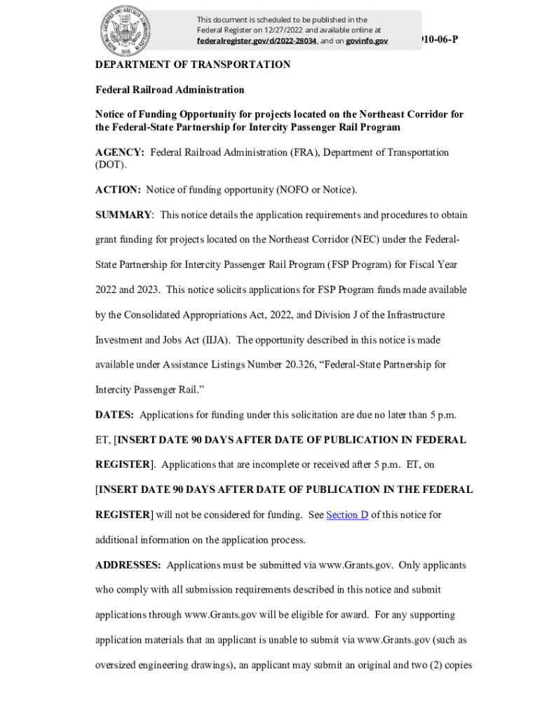This document is scheduled to be published in the Federal Register on 12/27/2022 and available online at federalregister.gov/d/202228034, and on gov info.gov491006PDEPARTMENT OF TRANSPORTATION Federal