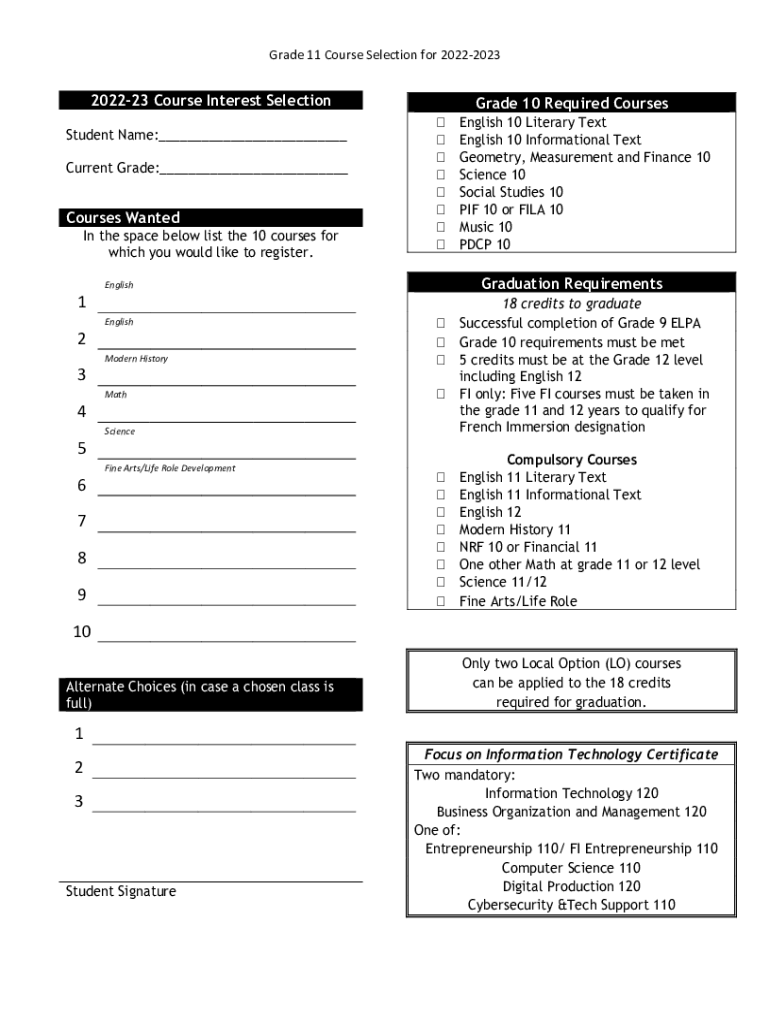 Grade 11 Course Selection for 20222023202223 Course Interest Selection Student Name:___ Current Grade:___Courses Wanted In the space below list the 10 courses for which you would like to register.1